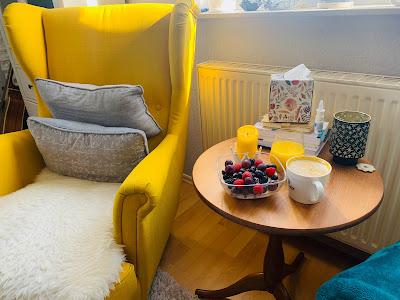 Man muss aus allem das Beste machen... und wenn man schon eine Auszeit verordnet bekommt, dann wenigstens mit einem leckeren und gesunden Frühstück... einer Tasse Kaffee und einem Glas O-Saft. Lecker!!! Und das im Lieblingssessel - was gibt es besseres, um in den Tag zu starten?